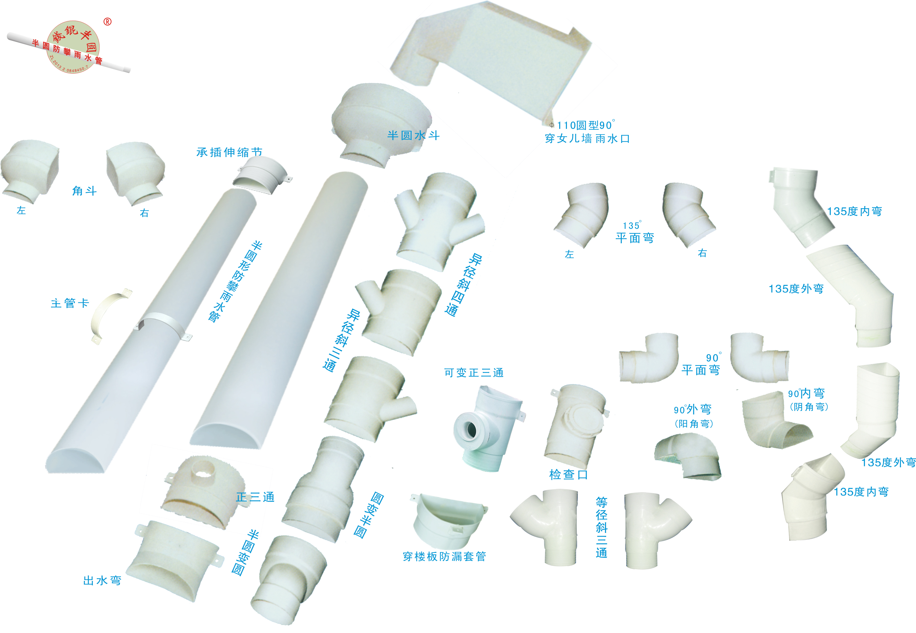 半圓形防攀PVC雨水管安裝時:配件承插伸縮節承頭(大頭)朝上,插頭(小頭)朝下,雨水管下端插入承插伸縮節的承頭、承插伸縮節的小頭再插入雨水管內,由上至下進行安裝。